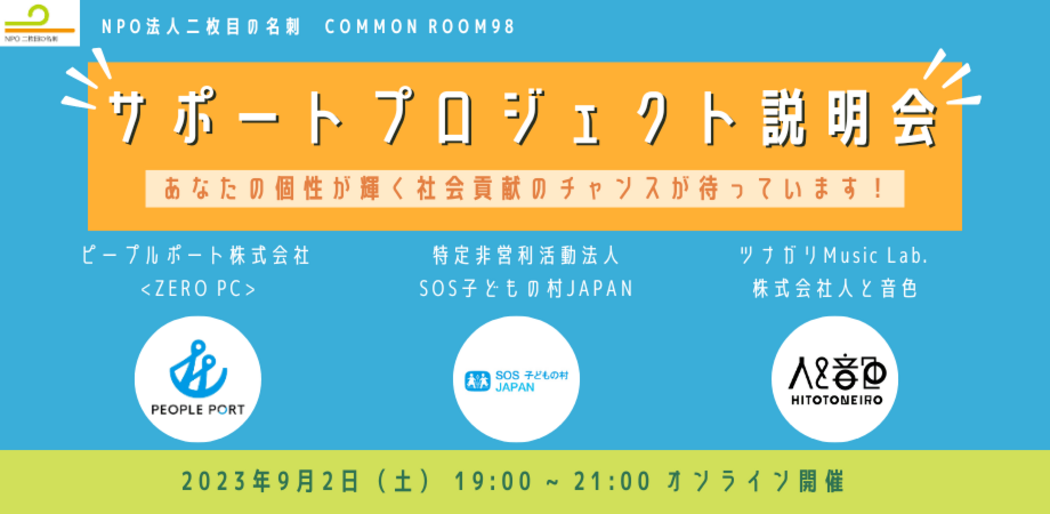 23年9月2日 19:00-21:00 のCommonRoom98(説明会)に参加いただき、団体のお話をお聞きください。そこで共感した団体と一緒にプロジェクト(3ケ月)がスタートします。 |