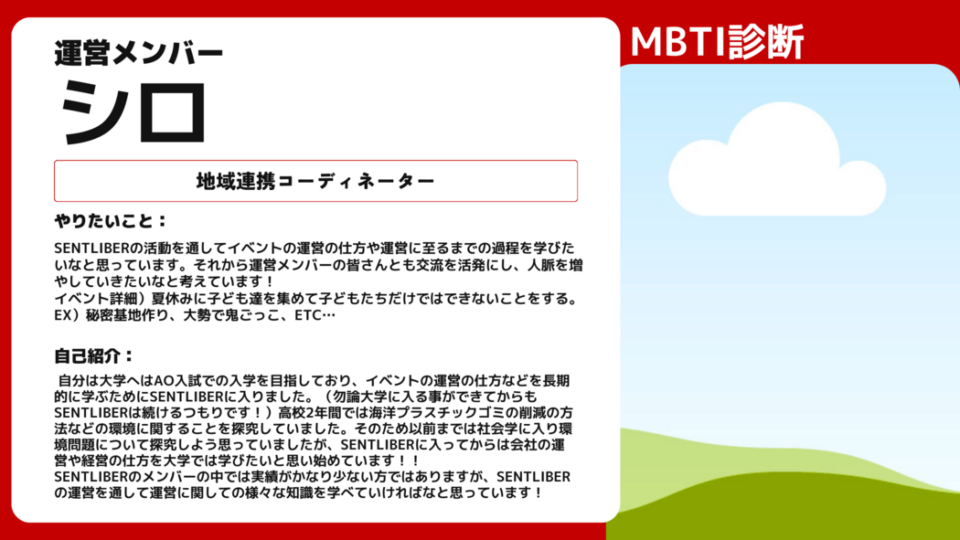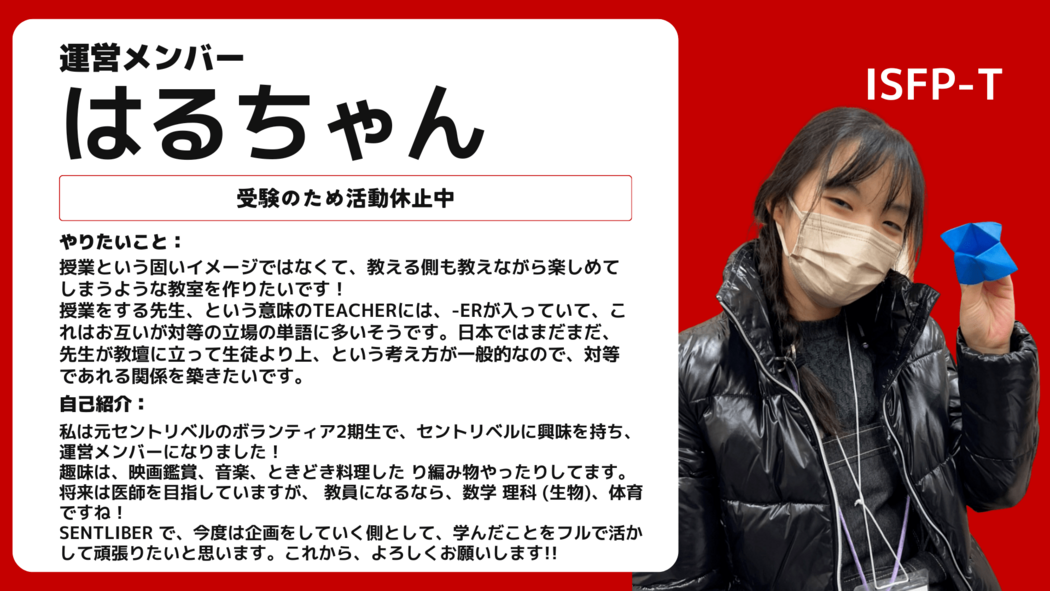【活動内容】セントリベルの企画に関わらず、受験や学校、家庭などで起こる心の問題を抱えている生徒に、自分らしい未来のある生活を過ごせるよう支援していきます。生徒と月に一度Zoomを用いて1対1の面談を行い、生徒を精神面からサポートしていきます。