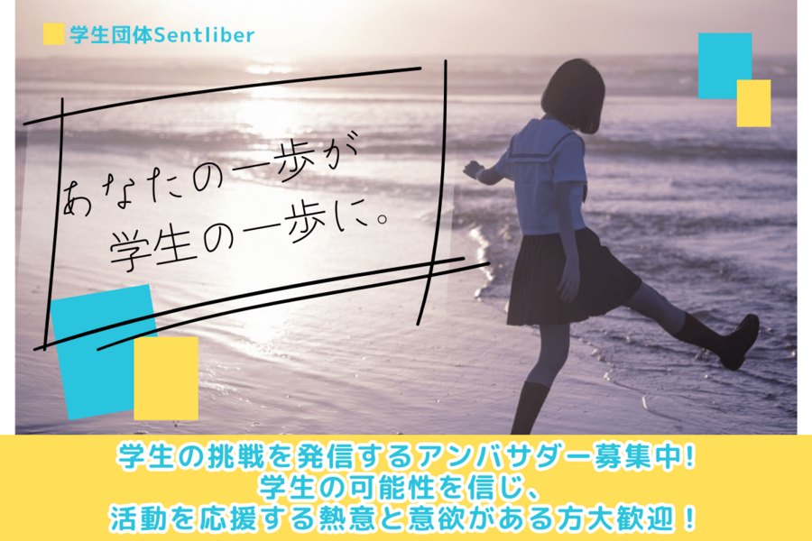 学生団体Sentliberでは運営メンバーとして団体に所属する学生の挑戦を発信し、サポートしながら学生が自己実現を出来るように応援してくださる社会人・学生アンバサダーを募集しています!