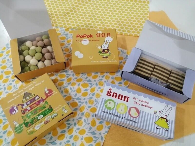 NOM POPOKは、カンボジアの子どもたちの栄養改善を目指して、健康的な食生活や栄養について学ぶ授業の実施と、健康的なお菓子の販売を行っています。POPOKとは、カンボジア語で「雲」を意味しています。雲のように、身軽に、自由な発想で、子どもたちに愛されるお菓子を作り、健やかな成長に寄り添いたいという想いを込めて、つけられた名前です。事務所は首都プノンペンにあります。