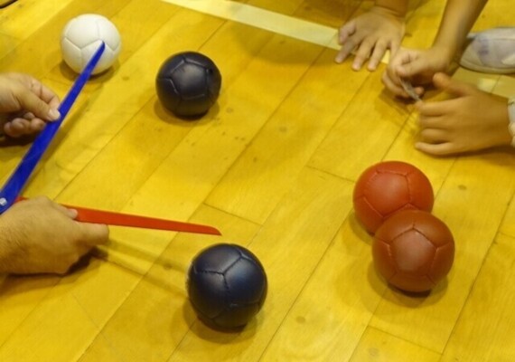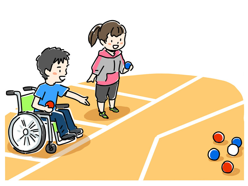 ヨーロッパで生まれたボッチャは、重度脳性麻痺者もしくは同程度の四肢重度機能障がい者のために考案されたスポーツで、パラリンピックの正式種目です。ジャックボール(目標球)と呼ばれる白いボールに、赤・青のそれぞれ6球ずつのボールを投げたり、転がしたり、他のボールに当てたりして、いかに近づけるかを競います。ボールは上から投げても、下から投げても、蹴っても構いません。