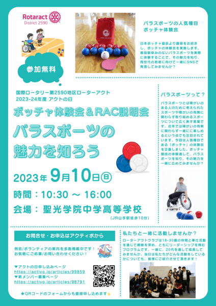「アクトの日」とは、私たち「ローターアクトの団体名にちなみ、9月10 日(=アク[9] ト[10])に最も近い週末に奉仕活動を行う毎年恒例の行事です!過去には防災をテーマにしたイベントや、手話講座、清掃活動などを実施してきました。今年度のテーマは『パラスポーツの魅力を知り、体験し、広めよう』。ボッチャ競技の体験を通してその魅力を知り、一緒に同世代の若者に広めてみませんか?