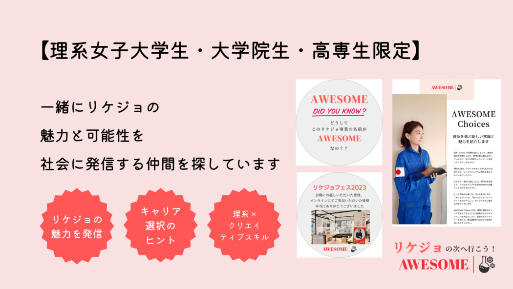 AWESOMEは、多様なリケジョが「繋がる」だけでなく、共に「アイディアをカタチにする」ことで、彼女たちが持つ魅力やポテンシャルを内外に発信するプラットフォームです。