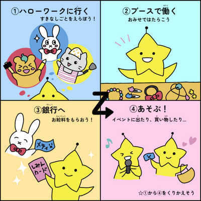 | 詳細 | 【事前】では、子どもたちと一緒にお店を決めていきます。お店に必要なグッズを考えたり、子どものアイディアをひろげます。 【本番】では、事前のお店に関わり、見守ります。 | 【本番】 ①メインサポーターの指示のもと、当日、子どもたちの安全を見守ります。 | 【本番】 テント設営や自転車整理、列の誘導をお願いします。 |