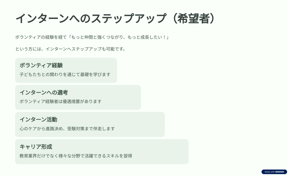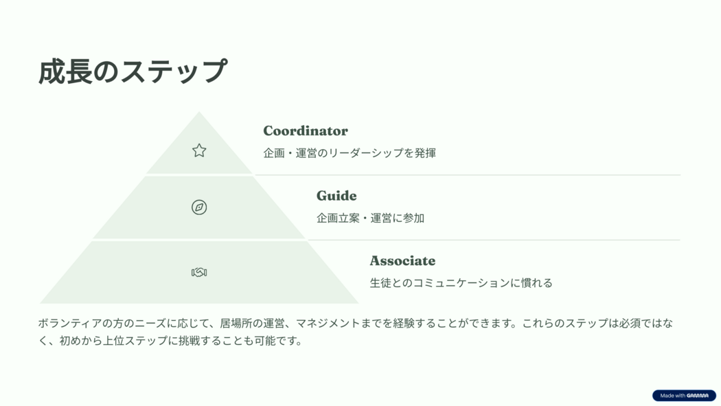 以下のStepを踏んでいき、研修や実践を通していく中で、より深く生徒と関わったり、生徒とのイベントを企画していくなど、「子どもたちにとっての居場所をデザイン」できるようになっていきます。