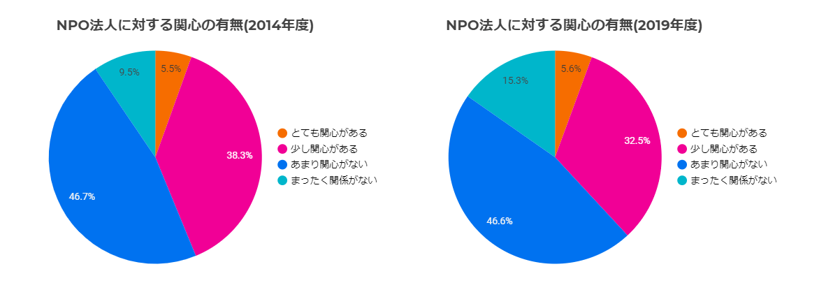 NPO法人に対する関心について、関心を持っている層が43.8%と最も多かった2014年度の同調査と比較すると、「少し関心がある」割合38.3%から32.5%に減り、「まったく関心がない」割合は9.5%から15.3%に増えていることがわかります。