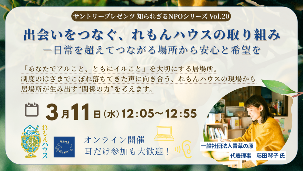 シリーズでお届けするこの企画、Vol.20となる今回は、東京都新宿区にある一軒家の居場所「れもんハウス」を拠点に、誰もが安心して過ごせる“あたたかい社会”をつくることを目的に活動する一般社団法人 青草の原から代表理事の藤田 琴子 氏をお招きします。