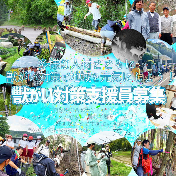 高齢化・人口減少集落への鳥獣被害軽減技術普及と地域活性化を目指し、鳥獣被害に強い集落づくりを進めながら、多様な人材の参画を促し、地域を元気にする「獣がい対策支援員」を募集します。