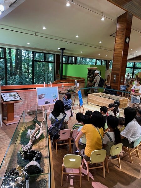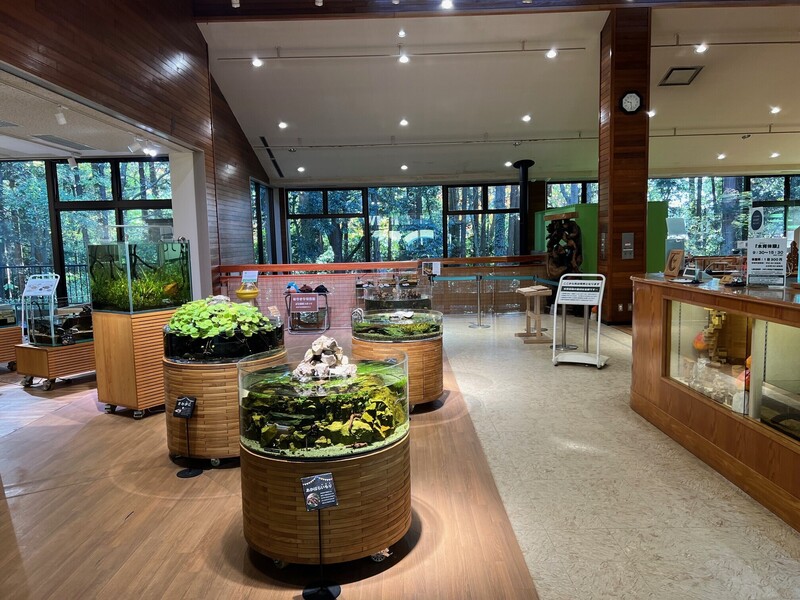 2024年で35年目を迎える施設の拠点は「ネイチャーセンター」と呼ばれる大型の観察施設で、レンジャー(自然管理員)が常駐して年間5万人ほどの来園者への自然解説活動を行っています。このレンジャー業務には2本の柱があり、一つは豊かな森林生態系の環境保全活動、具体的には林床の整備(下草刈りや剪定)、野生動物の保全(生息環境づくり)であり、もう一つが来園者への「ネイチャーガイド(自然案内)」「木育体験」「アクアリウム体験」の場の提供といった環境啓発活動です。