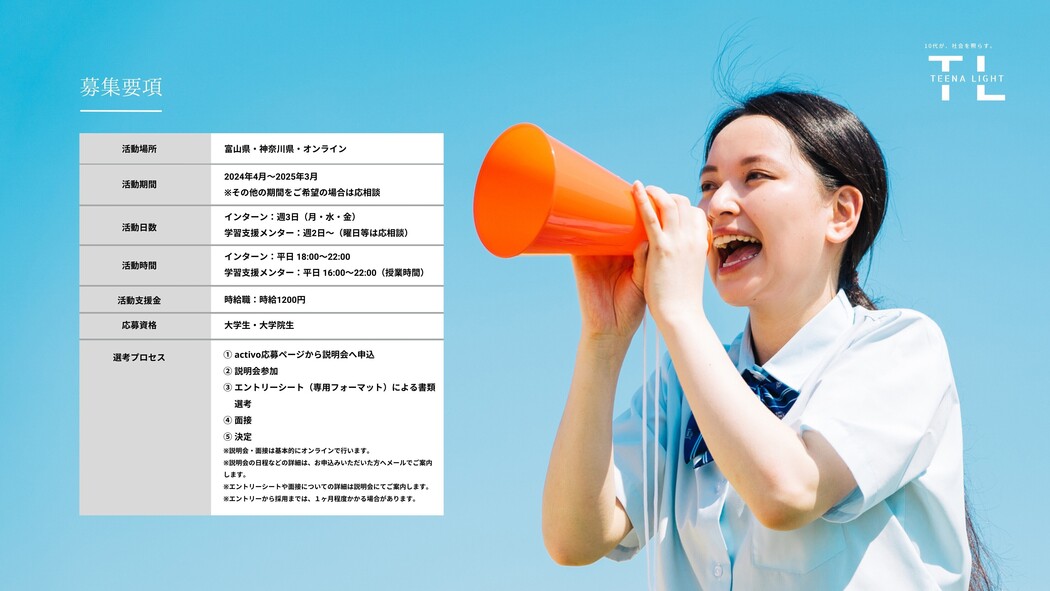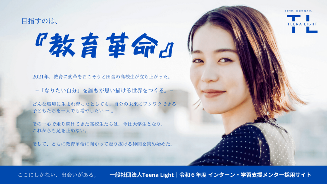 一般社団法人Teena Light(テーナライト)は、2021年から自治体/企業/NPOと連携し、教育支援事業を展開しています。今回、同事業において子どもたちの未来を切り拓くための学生インターンを募集しています。ご興味のある方は、下記の応募フォームよりお申込みいただき、オンライン説明会にご参加ください!