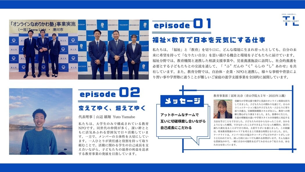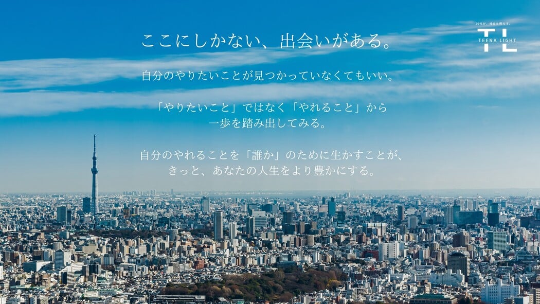 高校時代のボランティア活動から感じた課題意識をもとに、キャリア教育系の社会企業として「高校生ボランティア団体 Teena Light」を一般社団法人化。「一人ひとりが社会を担い、必要とされる未来に『ワクワク』しよう」をモットーに、10代が挑戦したいこと・学びたいことに満ち溢れた時間を過ごし、これまでにない体験に巡り合えるサービスを開発。