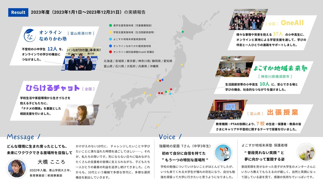 オンライン個別指導塾OneAllは、一般的な塾と同様に運営する一方で、児童扶養手当受給世帯や住民税非課税世帯といった一定の条件に該当するご家庭のお子さんや、児童養護施設との連携のもと社会的養護を必要とする子どもの学習支援を行っています。行政事業であるオンラインなめりかわ塾では、不登校児童生徒を含め学校外での学びの場を必要としているお子さんの学習支援をはじめ、外国にルーツのあるお子さんの日本語教室を開講しています。土地から学習塾や習い事に通うことが難しいご家庭に対する教育支援をオンラインとしての強みを活かしながら展開するとともに、よこすか地域未来塾では、実際に拠点を設けて高校生までの進学支援を行っています。