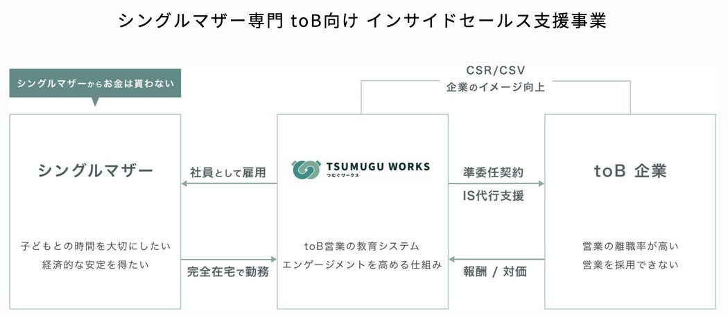 「子育て」と「収入」を両立できる働き方で、日本のひとり親世帯のワーキングプアを改善することをミッションに、シングルマザーに特化した toB向け インサイドセールス支援事業を展開する企業です。 インサイドセールスプレイヤーとしてシングルマザー(ママさん)人材を起用し、ワーキングマザーの皆の活躍により、小回りの効くインサイドセールス支援として様々な企業様の利益を創出と社会課題の解決を目指しております。