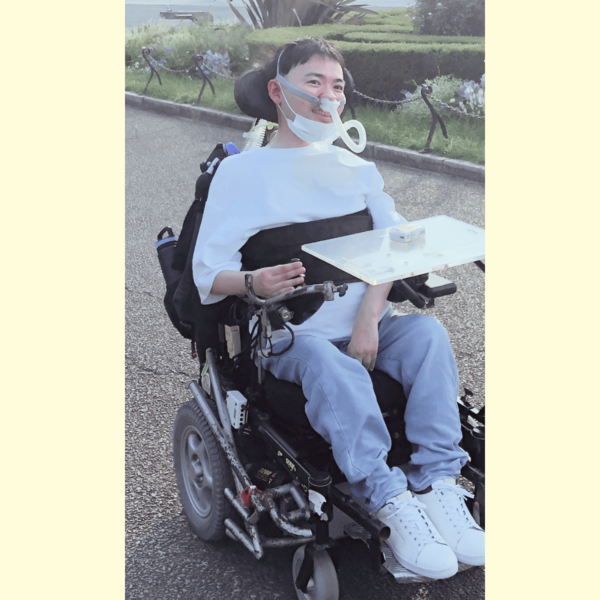私は1歳で進行性筋ジストロフィーを患い、小6から車椅子生活になりました。当時は、車椅子に乗る自分が恥ずかしく、学校で友達と話すことや、介助を頼むことができませんでした。自分の障害をまだ受け入れられず、自信が持てなかったのです。しかし、高1の時、当時所属していた電動車椅子サッカーというスポーツチームキャプテンのSY君に「もっと自分を出しなさい」と言われ、その一言で「変わりたい」と思うようになりました。それから少しずつ仲間と積極的に話せるようになり、学校生活も楽になりました。