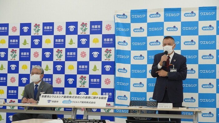 記者発表会・調印式開催(市原市長、ウエルシア薬局社長が参加)