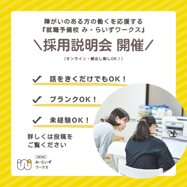 働きづらさを感じたり、発達障がい、知的障がいの方が働く準備をしている就職予備校「み・らいずワークス」ではスタッフを募集しています!まずは話をきくだけでも大丈夫です。お気軽にご参加ください!