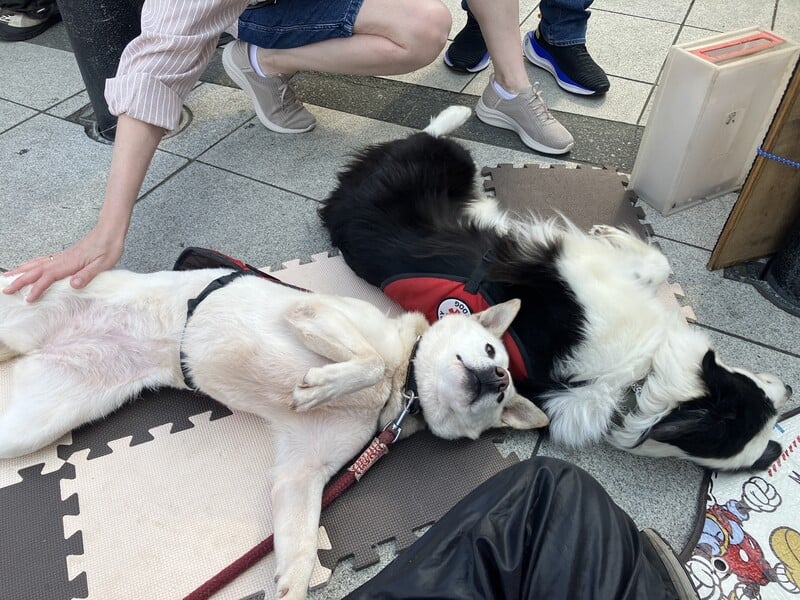 動物愛護や保護の啓発活動と、犬たちの人馴れやセラピードッグのトレーニング、更に人間のハンドラーとしての訓練が一度に出来る上に、待ちゆく人や子供たちに動物とのふれあい体験をして、動物への関心を高めてもらう大切な活動です。