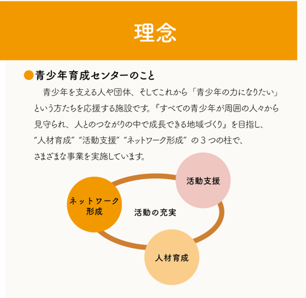 「すべての青少年が周囲の人々から見守られ、人のつながりのなかで成長していくことができる社会を醸成するとともに、様々な体験を通じ青少年自らが学び育つ機会を提供することにより、未来を担う青少年の成長に寄与する」ことを目的に、青少年育成における公益的使命を果たしてまいります。