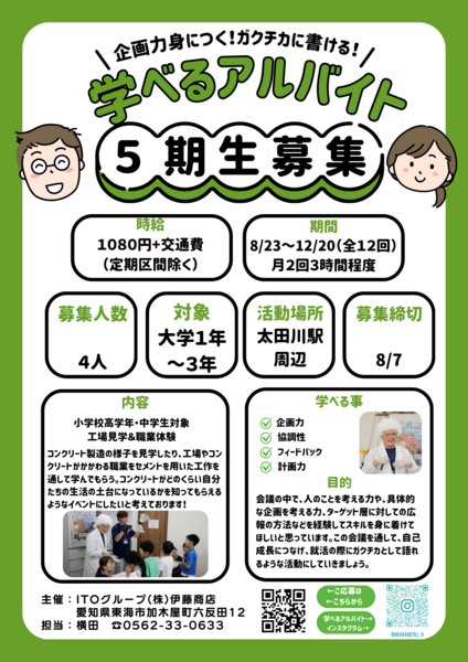 約4か月間、弊社の社員と協力して地域貢献活動を考え、実施して下さる学生を大募集しております。学びながらお給料をいただける、通称「学べるアルバイト」の5期生になりませんか?