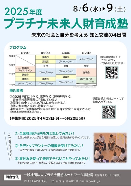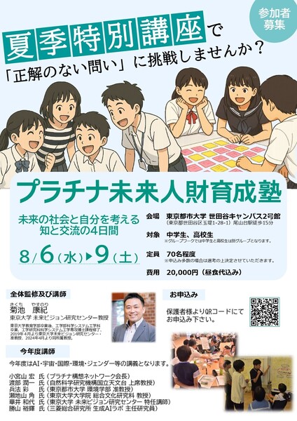 中高生向けの夏期短期講習「プラチナ未来人財育成塾(※)」におけるシニアチューターを募集します。