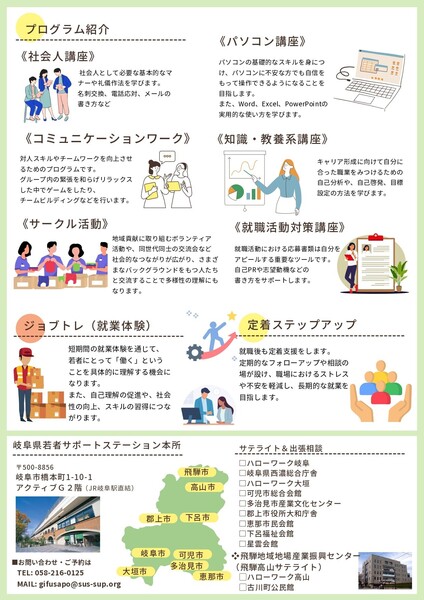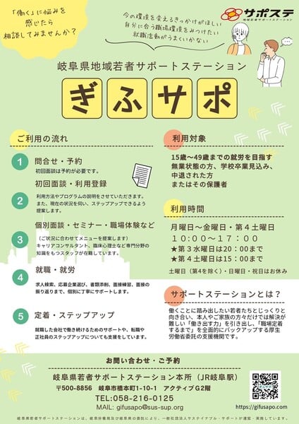 ◇「岐阜地域若者サポートステーション」(厚生労働省委託事業)での若者の自立・就労支援に関する業務です。