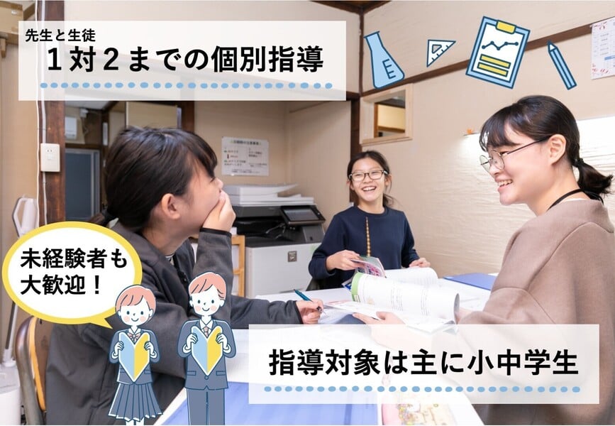 実際の個別指導では、業務に慣れるまで「先生1人に対し生徒1人まで」しか担当しません。また、教科や学年はあなたの希望に沿って決定いたします。