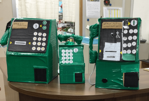 スマートフォン世代の子どもたちが、防災教室で教わった電話に興味津々…自分たちで段ボールで公衆電話を作りました。