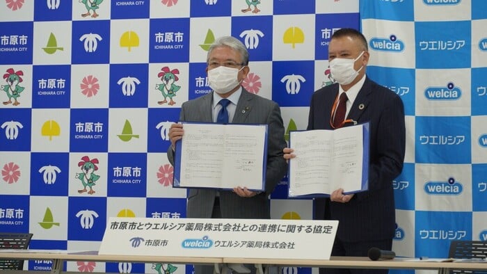 記者発表会・調印式開催(市原市長、ウエルシア薬局社長が参加)