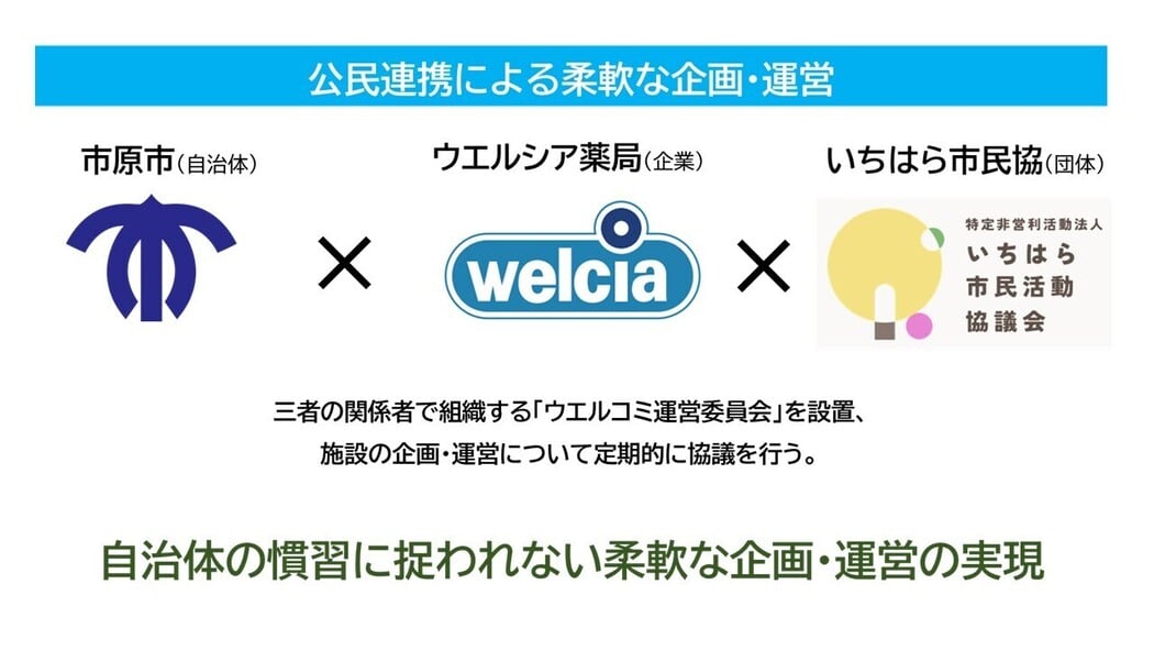 ウエルシア・コミュニケーションセンターいちはら(ウエルコミ)は、市原市・ウエルシア薬局・NPO法人いちはら市民活動協議会の3者が連携して運営している施設です。