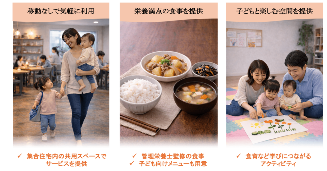 共働き子育て家庭を主な対象とし、集合住宅の共用スペースを活用した食事提供と親子向けアクティビティの提供に取り組みます。食事は栄養管理士の監修のもと、集会所内のキッチンスペースで調理した栄養バランスの取れた温かい食事を提供して親の家事負担を軽減するとともに、親子アクティビティの提供により親が子どもに関われる時間の創出を図ります。親子アクティビティでは「お米の重量当てクイズ」、「野菜の切れ端を使ったお絵描き」などの食育体験、生成AIを活用したキャラクター作りといった学びにつながるアクティビティを実施します。現在、豊中市内の集合住宅1拠点にて月2回のペースで実施しており、今後他拠点への展開も行います。また、地域飲食店や教育関連企業との連携を図り、持続可能な運営体制の構築に取り組みます。