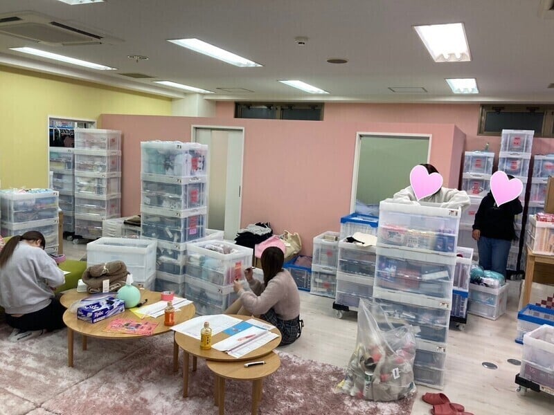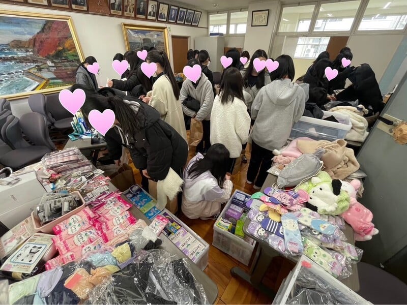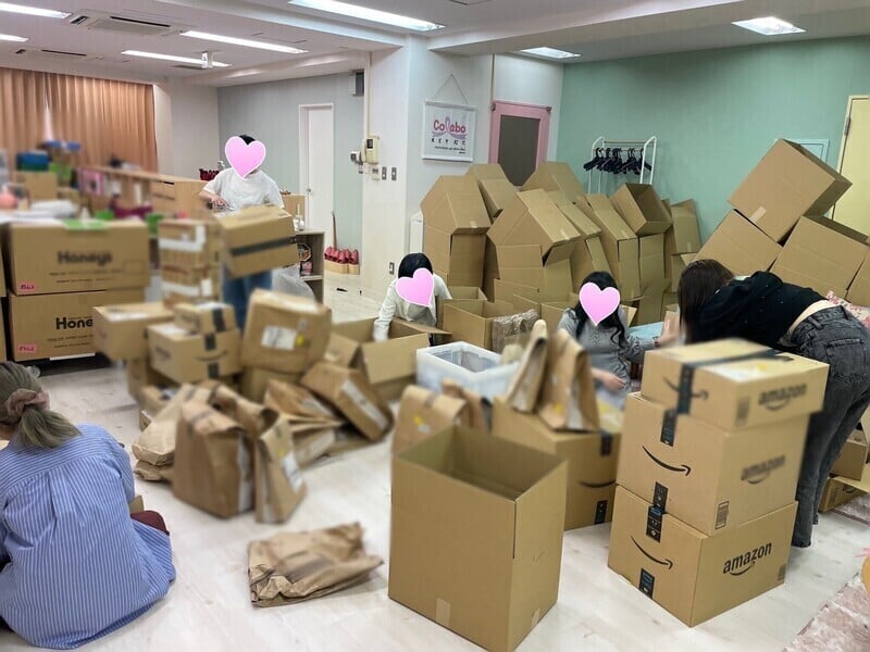 応援者の方からの寄付物品の開封と仕分けも少女たちと