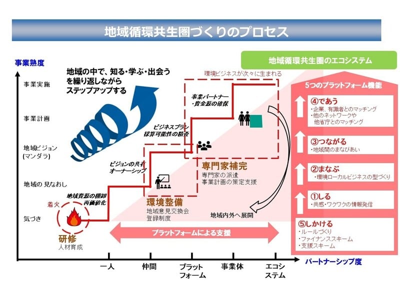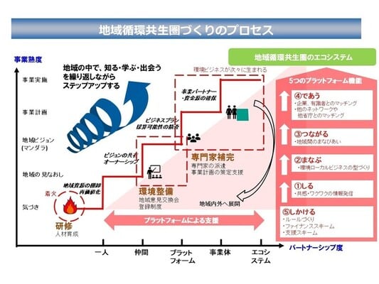 「地域循環共生圏」などの地域間プラットフォーム構築の取り組みにおいて、多様な主体の自発的行動を促し、「0から1を生み出すインキュベーター的支援力」を発揮しています。