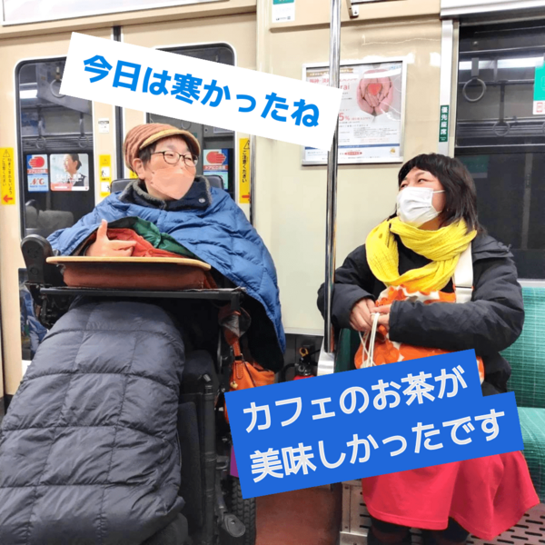 障害者:親元では親の都合で介助をされていたけれど、自立生活は介助者が私の決めた通りに介助してくれるので自由に生活できます。着たい服も食べたいものも私が決められます。ライヴや映画やカフェにも好きなときに行くことができます。
