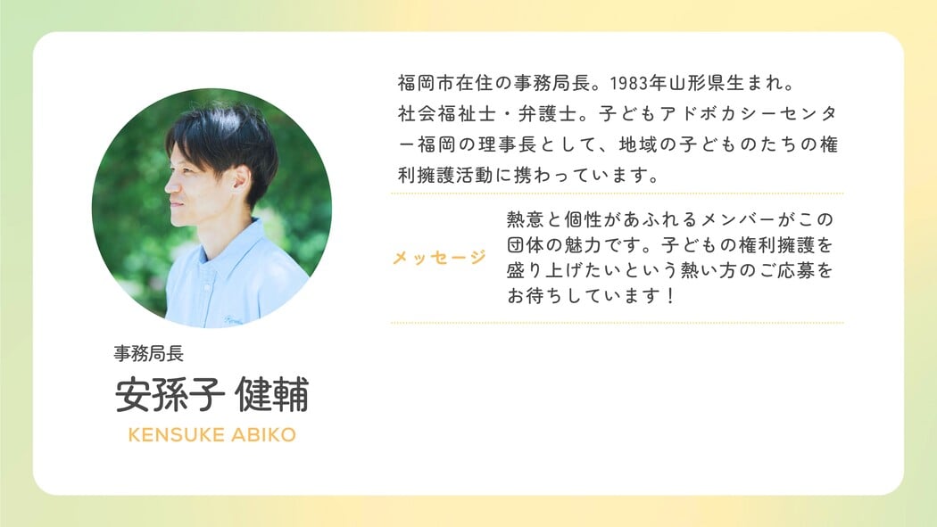 組織をどう良くしていくか、どうすれば子どもの声が社会にもっと届くか。それを自ら考え、仕組み化していく。将来的に組織の経営を担うリーダーへと成長していただくことを、心から期待しています。 - ・自分も相手も大切にできる環境