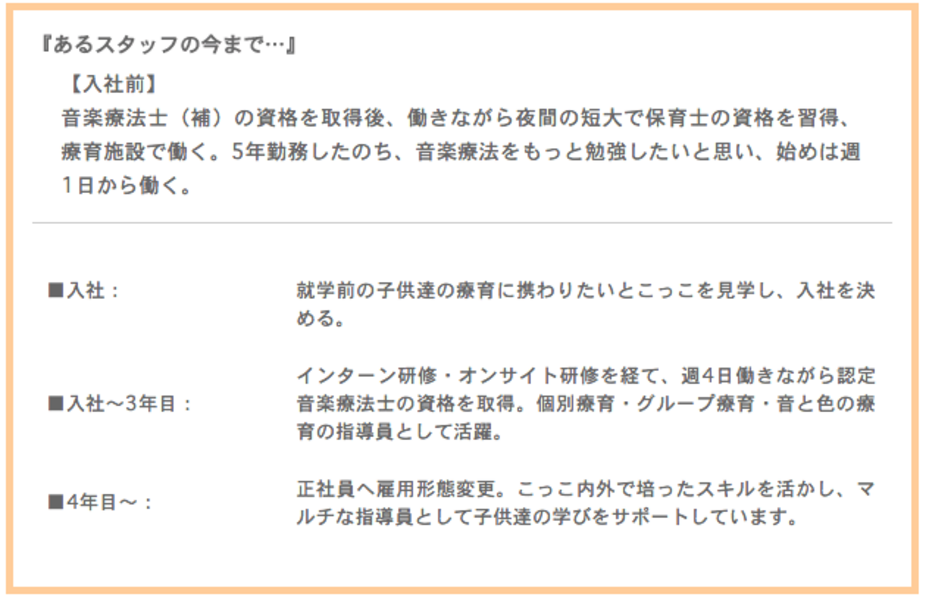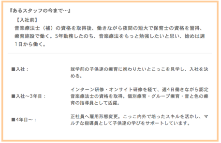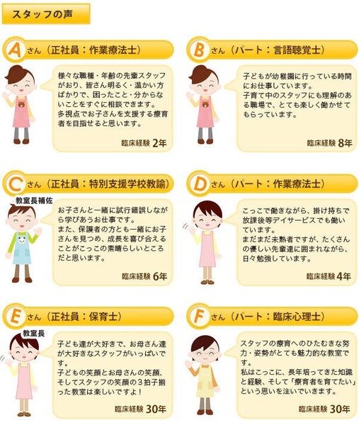 子どもの成長と自己のスキルアップを一番の喜びと感じて頑張りつづけられる人、試行錯誤しながら効果の上がる療育を作り上げる意欲を持った人、ぜひご応募下さい。思いを語り合いましょう。