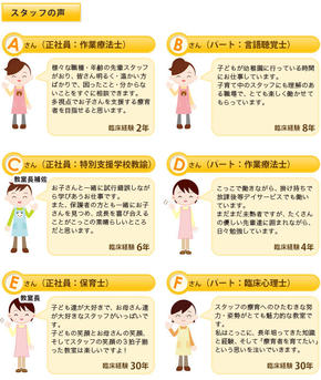 臨床発達心理士・言語聴覚士・作業療法士・特別支援教諭免許又はそれに準ずる資格のいずれかをお持ちの方で、障害児の発達支援業務を5年以上経験されている方。 |
