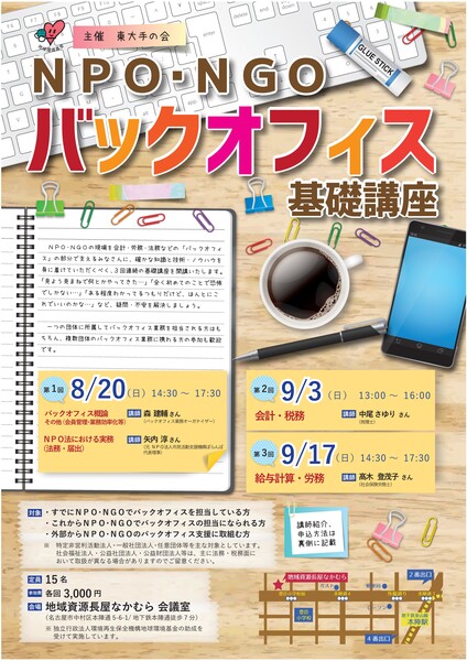 NPO・NGOの現場を会計・労務・法務などの「バックオフィス」の部分で支えるみなさんに、確かな知識と技術・ノウハウを身に着けていただくべく、3回連続の基礎講座を開講いたします。「見よう見まねで何とかやってきた…」「全く初めてのことで恐怖でしかない…」「ある程度わかってるつもりだけど、ほんとにこれでいいのかな…」など、疑問・不安を解決しましょう。