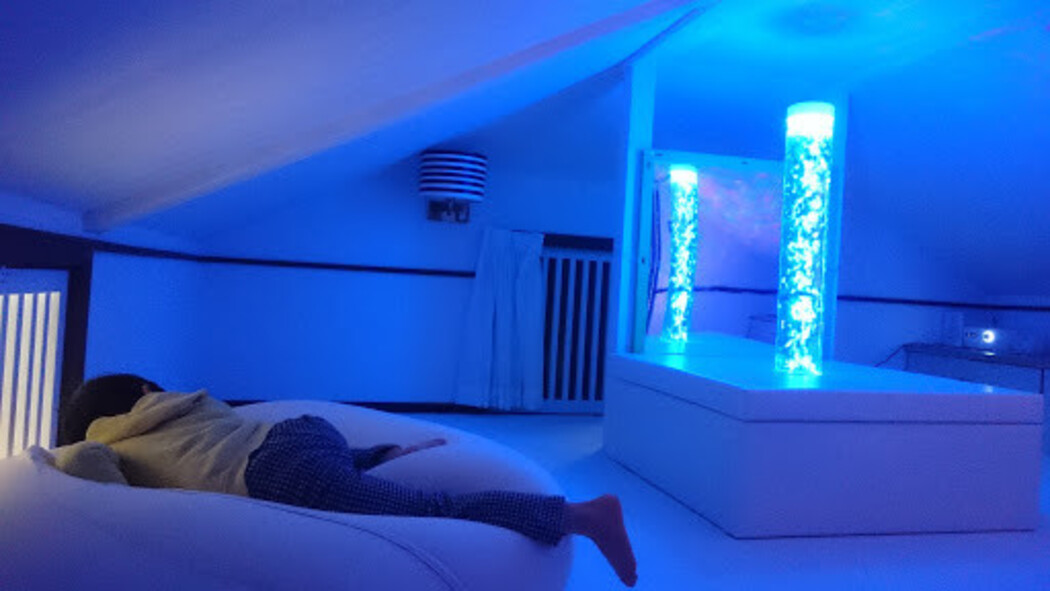 大人もこどももリラックスできるスヌーズレン。 「ベルテール三郷戸ヶ崎園」の屋根裏部屋はホワイトルームタイプのスヌーズレンになっています。自分のペースを取り戻したい子がのんびり過ごせる空間にしています。子どものストレスはほとんどがお友達との関わりの中で生まれることに着目し、ストレスを感じにくい環境を整備することで、より実効性のある支援を行っています。 |