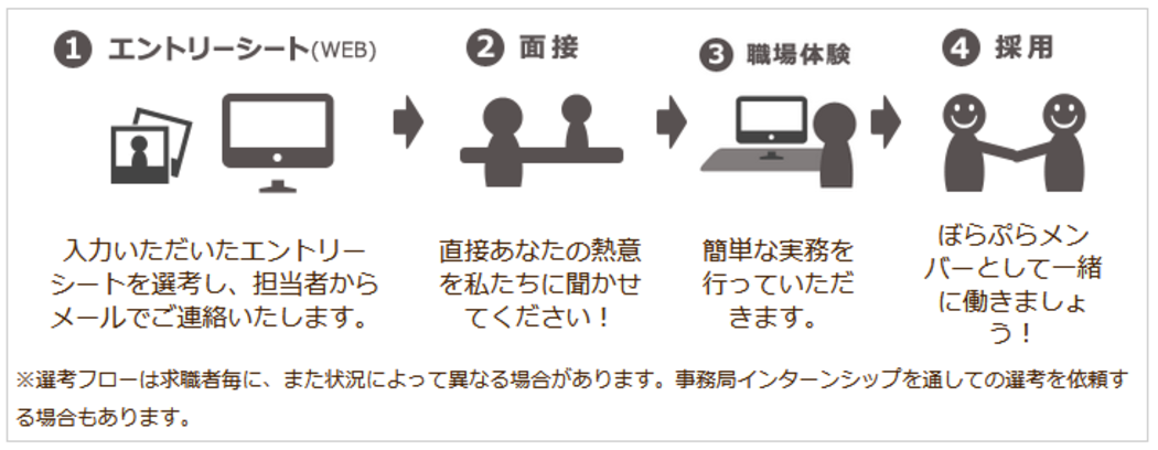 選考に関しましては、基本的には書類選考から始まり、面接、職場体験の流れとなります。