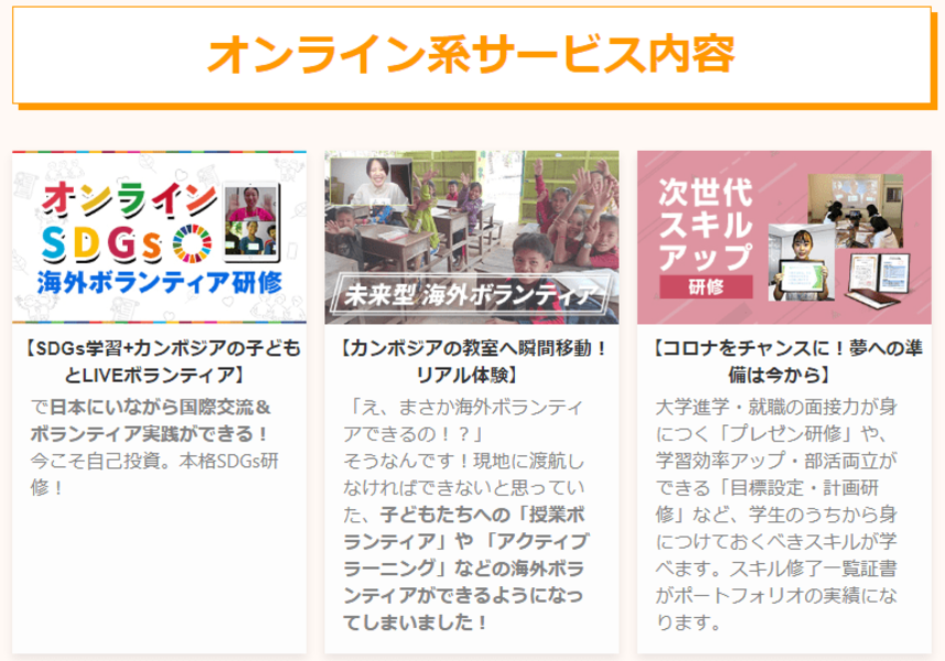 当団体は中学生・高校生・大学生・社会人と幅広い方を対象に、 SDGsに関連する「オンラインSDGs研修」「オンラインボランティア」「スキルアップ研修」「SDGs小論文コンテスト」「渡航型海外ボランティア」 「SNSコミュニティ」「SDGs継続アクションプロジェクト」「SDGs導入コンサル」等のサービスを総合的に提供し、SDGsを推進するプラットフォーム型のNGOです。