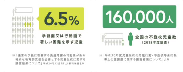 文科省の調査によると、学習面または行動面で著しい困難を示す児童は6.5%、不登校16万人。