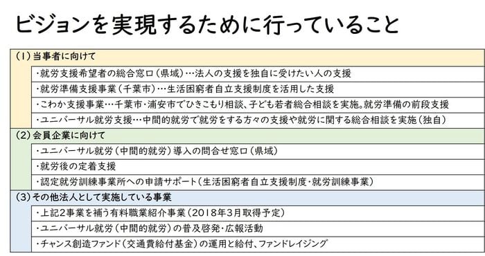 主事業は、千葉市などから4つの公的事業を受託し、総合相談や就労支援を行っています。