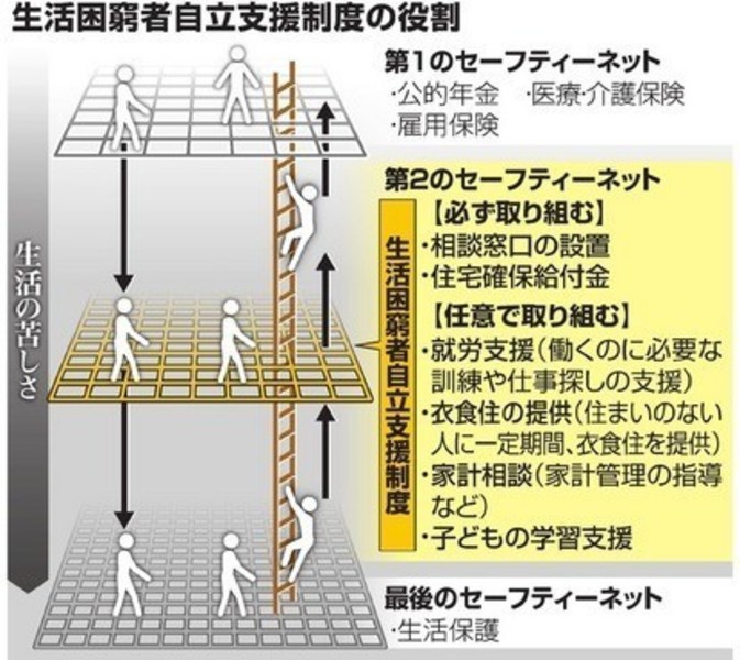 また制度が生まれた背景には増加する非正規雇用の方々のセイフティネットが脆弱であるという問題点を浮き彫りにした「派遣切り」の出来事もありました。職を失ってしまうと、住まいも失って、一気に生活保護を受けるところまで困窮してしまう状況は「派遣村」として話題になりました。生活困窮者自立支援制度は社会保険と生活保護の間にある第2のセーフティネットとしても期待されています。