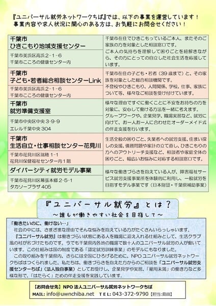 ※当事業所は、NPO法人ユニバーサル就労ネットワークちばと社会福祉法人生活クラブ風の村が合同で運営しており、生活クラブ風の村から出向という形となります。詳しくはお気軽にお問い合わせください。