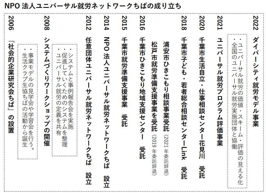 設立当初は就労支援を主軸として活動をしてきましたが、社会的な要請の高まりを受けてひきこもり支援、子ども・若者の総合相談等、支援範囲を広げてきました。私たちの事業領域も広がり、就労支援のみならず、その人や私たち自身が可能な限り自分らしく生きてはたらけるよう活動をしたいと考えています。
