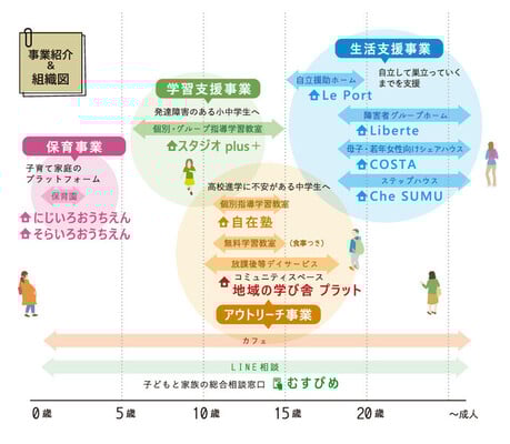 ダイバーシティ工房では、なにかあったとき、ふと「相談しよう」と思える場所を、学習教室・カフェ・コミュニティスペース、保育園など目の前の人の"ちょっと困った"に合わせてつくっています。