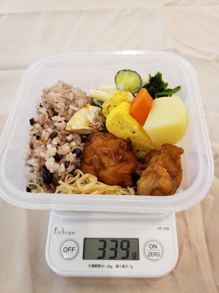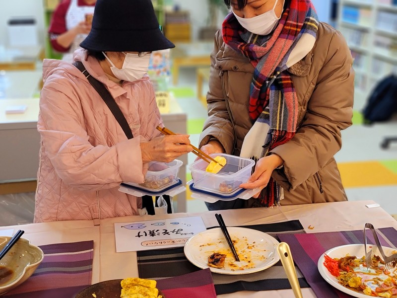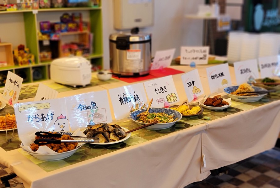 地域の人たちが買い過ぎた食材や消費期限切れが近い食材を持ち寄り、私たちが調理し1g1円のおばんざいとして販売しています。