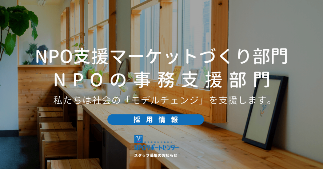 NPOサポートセンターでは、この度、事業体制を強化するために、「NPO支援のマーケットづくり事業」と「NPOの事務支援サービス」の2つの事業で「新スタッフ」を募集しています。