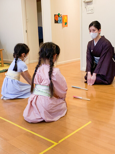 「日本舞踊教室」では日本舞踊の名取のお稽古の下で、日本舞踊の基本動作を用いて身体を動かし、体幹を鍛えながら礼儀作法や集中力、教養を身につけています。