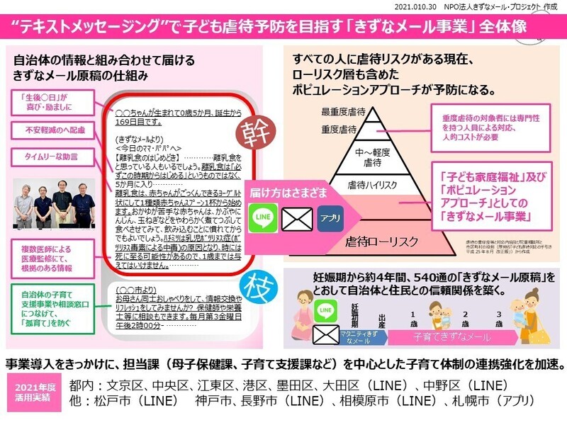 「きずなメール事業」の特徴は、「きずなメール」という、複数の専門医が監修した、妊産婦さんや乳幼児の子育てをしている家庭やその家族に向けたテキストメッセージ(原稿)を、主に自治体と協働して対象者に届けているところです。妊娠週数やお子さんの月齢に合わせた、行政の支援情報も一緒に届けます。